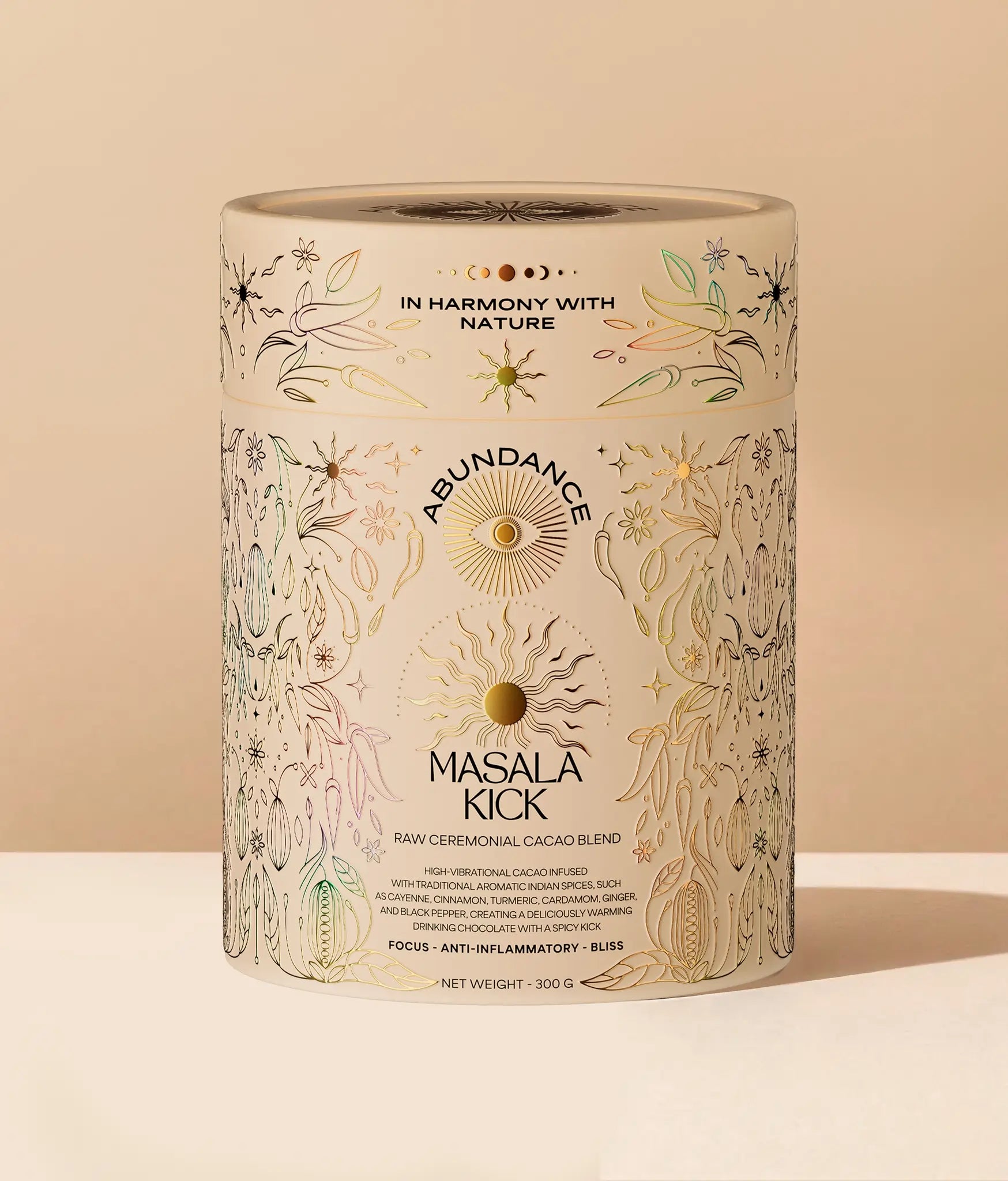 At its core is regeneratively grown Ceremonial Cacao — naturally abundant in magnesium and mood-supportive compounds. Turmeric adds earthy warmth and ancient anti-inflammatory tradition, while black pepper enhances its absorption and potency. Cinnamon and cardamom bring sweetness and digestive ease, ginger adds heat and movement, and a touch of cayenne offers a bright, energizing finish. Coconut blossom sugar balances the spice with soft caramel notes, while Himalayan salt rounds and lifts the overall profile.